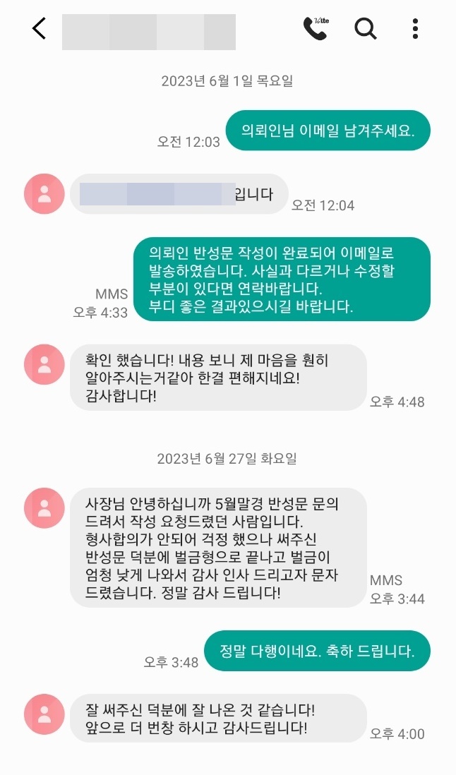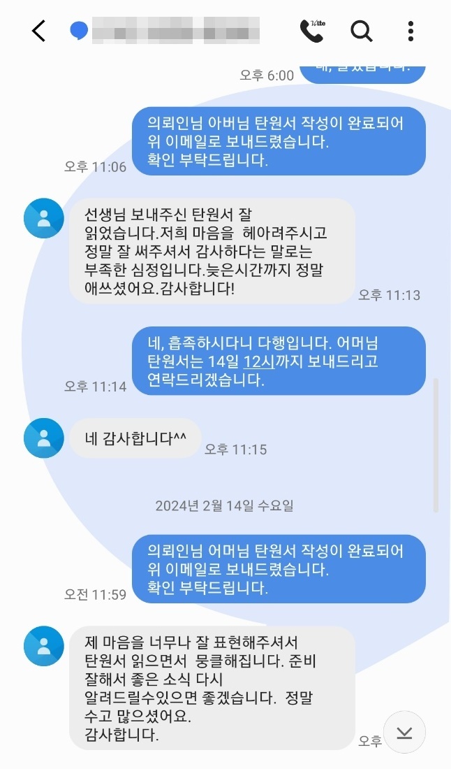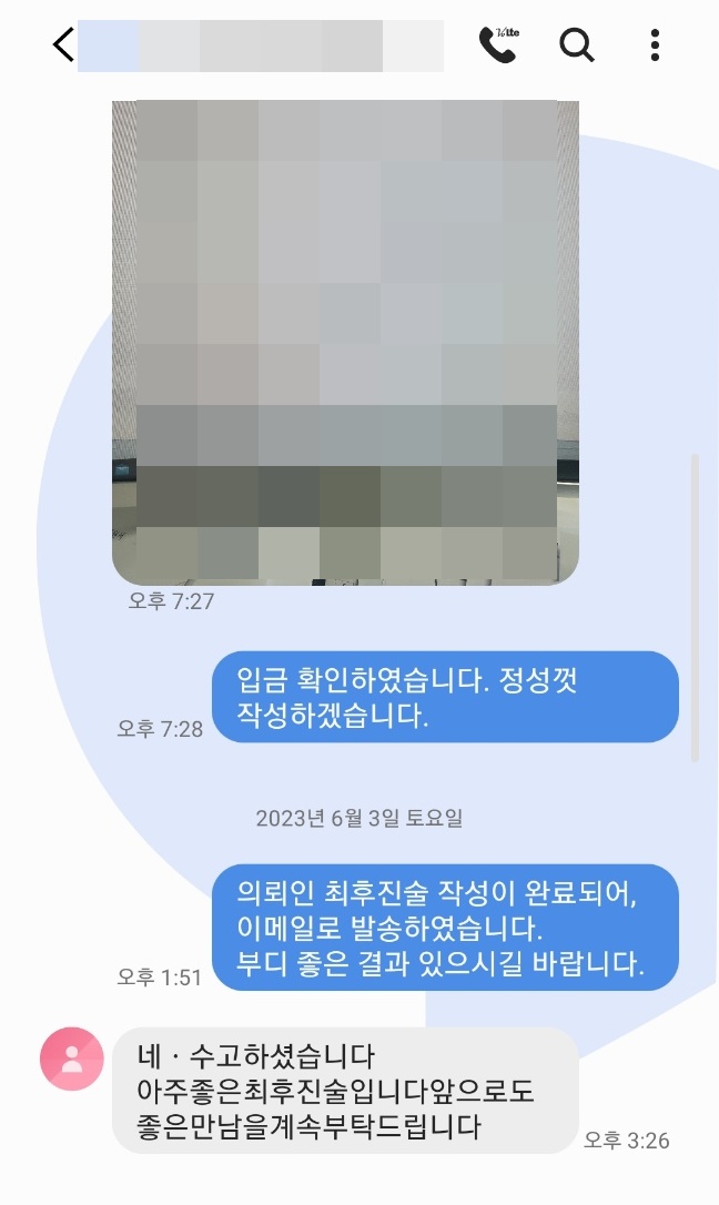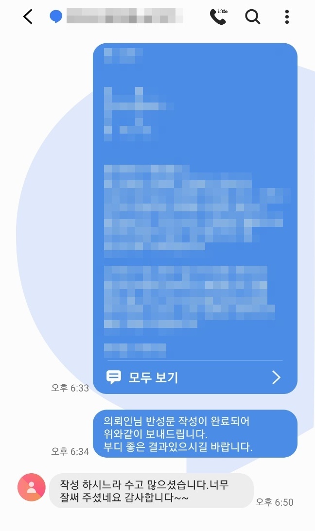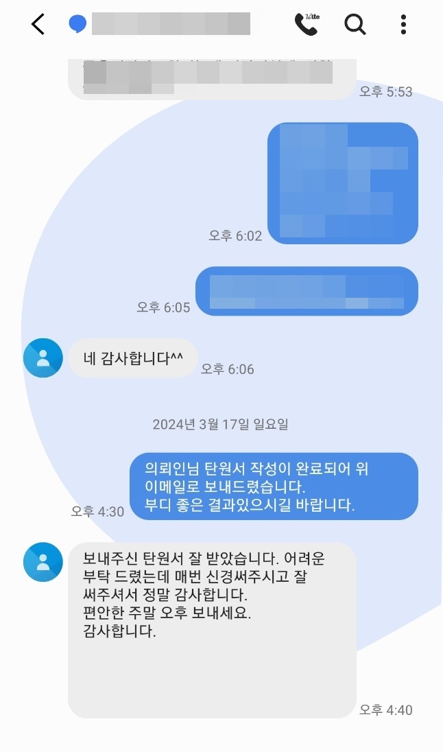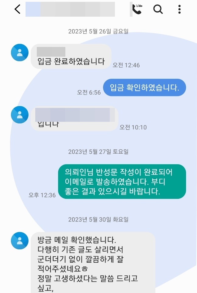 후기 의뢰 고객 후기 - 워드마스터 by wordmasterstudio 2023. 5. 19. 공유하기 게시글 관리 wordmasterstudio 저작자표시 비영리 변경금지 (새창열림) 사업자 정보 표시 포르투나 | 고재훈 | 서울 노원구 동일로 182길 10 | 사업자 등록번호 : 558-65-00304 | TEL : 010-5815-1891 | 통신판매신고번호 : 호 | 사이버몰의 이용약관 바로가기 '후기' 카테고리의 다른 글 결혼 축사 생생 리뷰 (0) 2024.07.04 관련글 결혼 축사 생생 리뷰